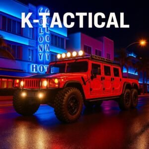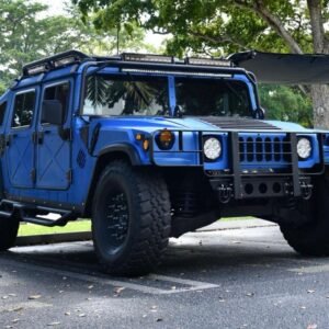 Fully restored 2013 HMMWV M1097 by K-Tactical, upgraded to 2025 standards. Metallic Blue Raptor finish, luxury handcrafted interior, modern tech hub, and complete mechanical renewal.