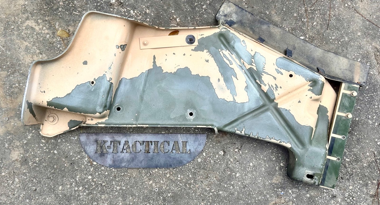 Original driver-side rocker / lower body cover panel removed from an HMMWV M1165 armored Humvee.