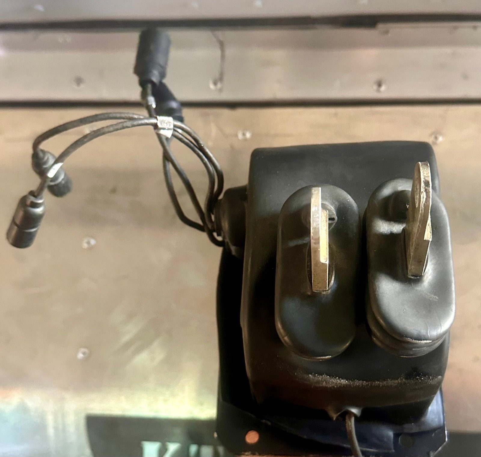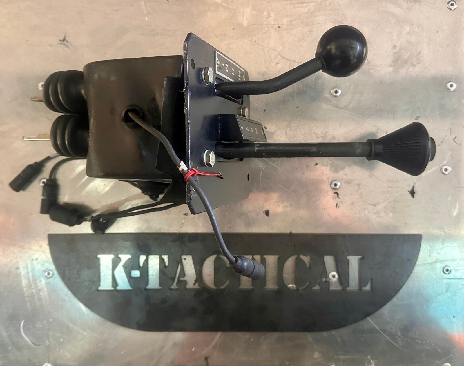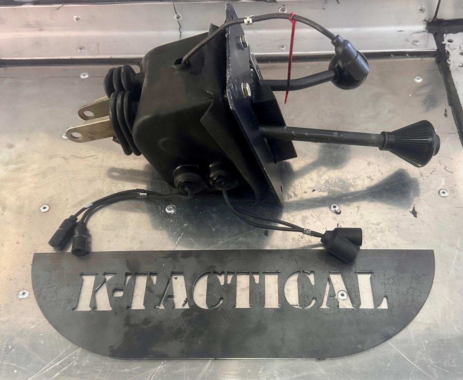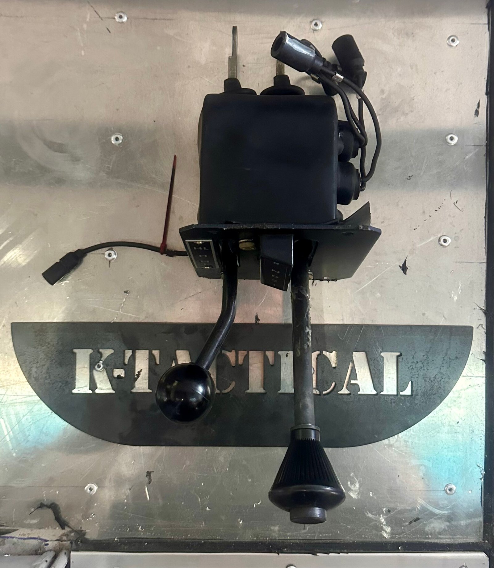 The unit includes the dash-mounted bracket, shift linkage arms, electrical switches, and wiring connectors, making it a complete control assembly for Humvee transmission operation.