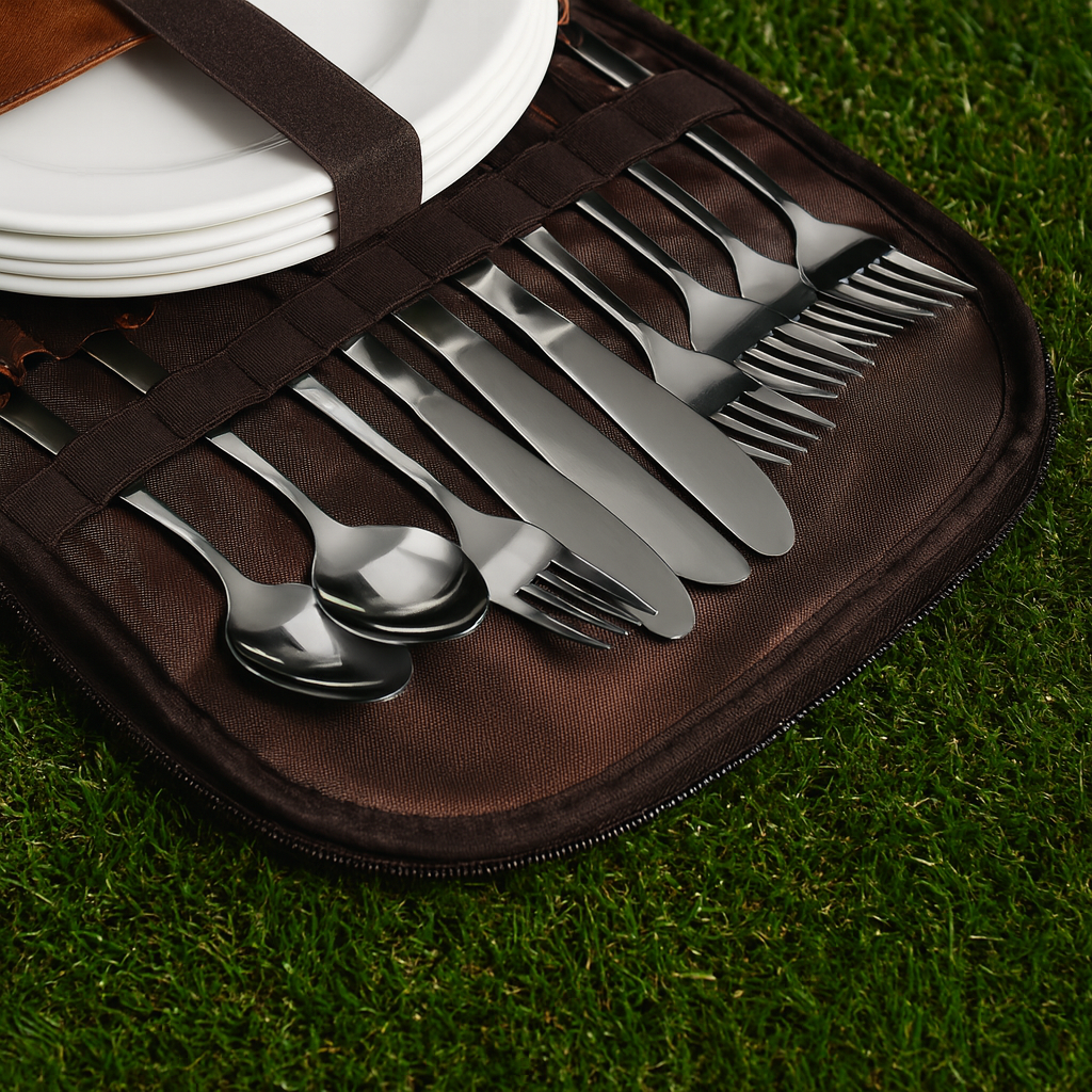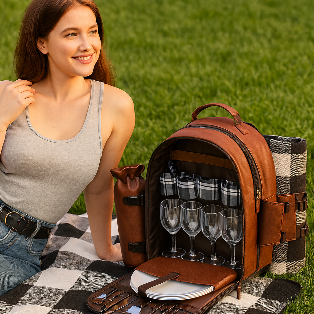 Designed for the modern adventurer with a taste for sophistication, it features dedicated compartments for cutlery, plates, wine glasses, and essentials, along with an exterior roll-strap for a picnic blanket. The soft patina of the leather promises to age beautifully, making it not just a bag, but an heirloom of journeys and gatherings.